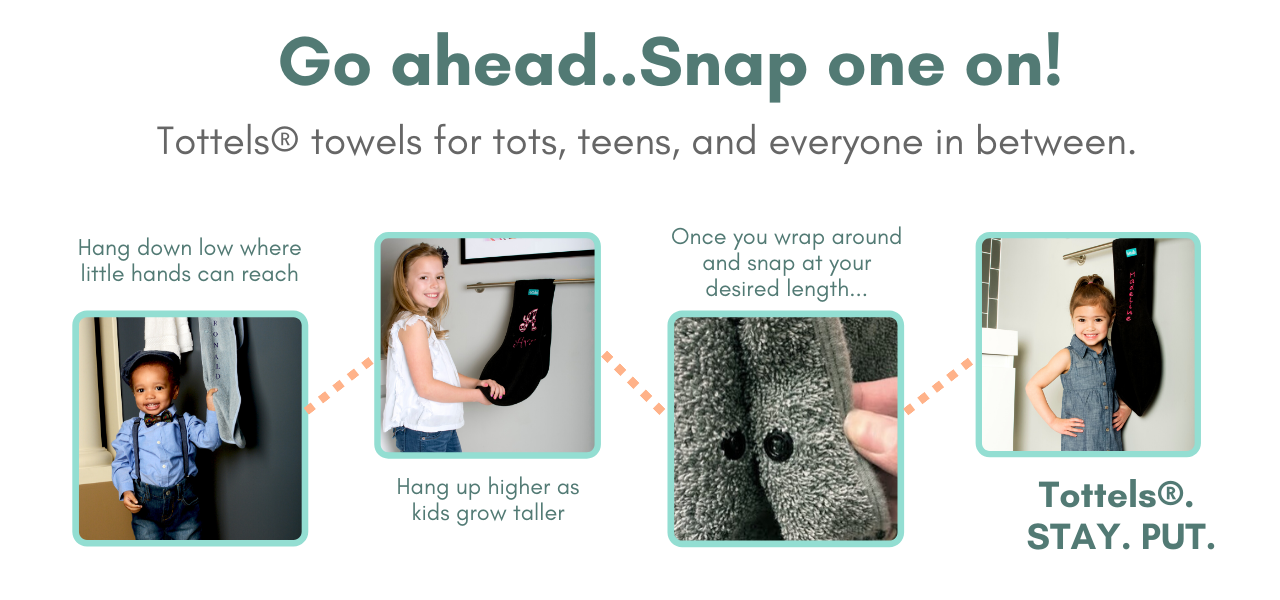 Secure your Tottels® towel in seconds. Wrap around the towel bar and snap the buttons at your desired height. Watch our demo video to see how it's done.
